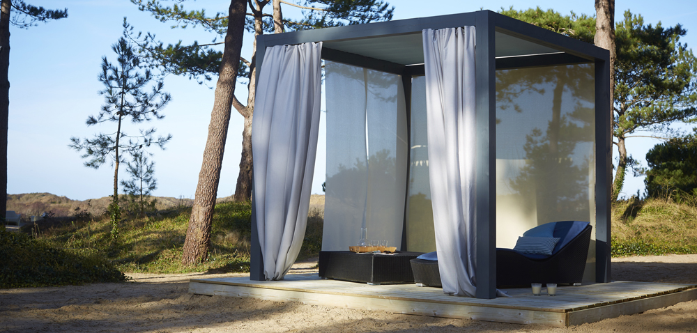 Les rideaux extérieurs sont conçus pour s'adapter aux pergolas. L'ajout des rideaux permet une protection face au soleil à la pluie de façon idéale sans occulter la vue ou couper les éventuelles brises de vent.